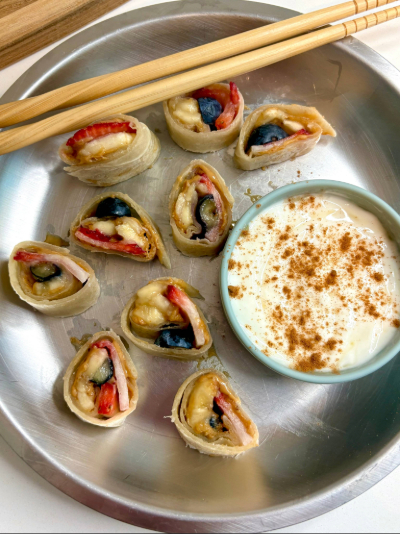 Fruit sushi is essentially a soft tortilla spread with peanut butter, layered with fresh fruit like bananas, strawberries, and blueberries, then rolled up and sliced into adorable sushi-style pieces. Pair it with a creamy yogurt dip, and you’ve got a balanced, kid-friendly meal that feels like a treat 🍱✨